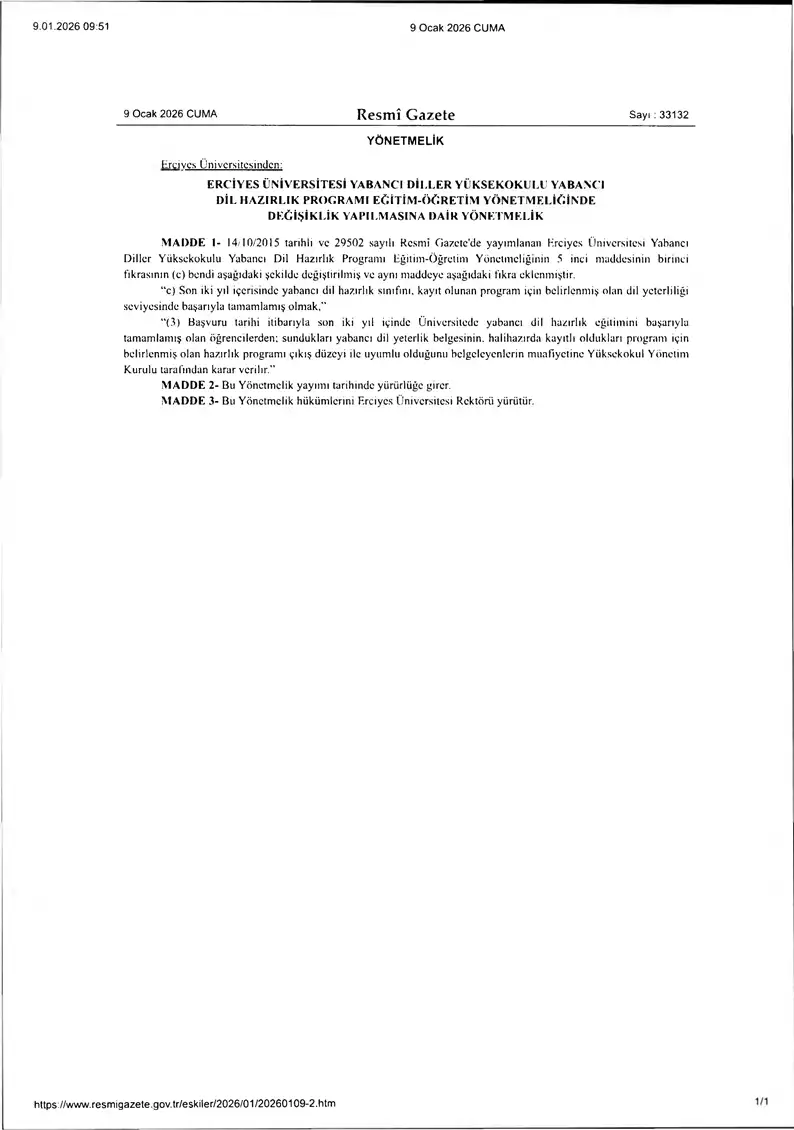 "Erciyes Üniversitesi Yabancı Diller Yüksekokulu Yabancı Dil Hazırlık Programı Eğitim-Öğretim Yönetmeliğinde Değişiklik Yapılmasına Dair Yönetmelik" 09 Ocak 2026 tarihli ve 33132 sayılı Resmi Gazetede yayımlanarak yürürlüğü girmiştir.